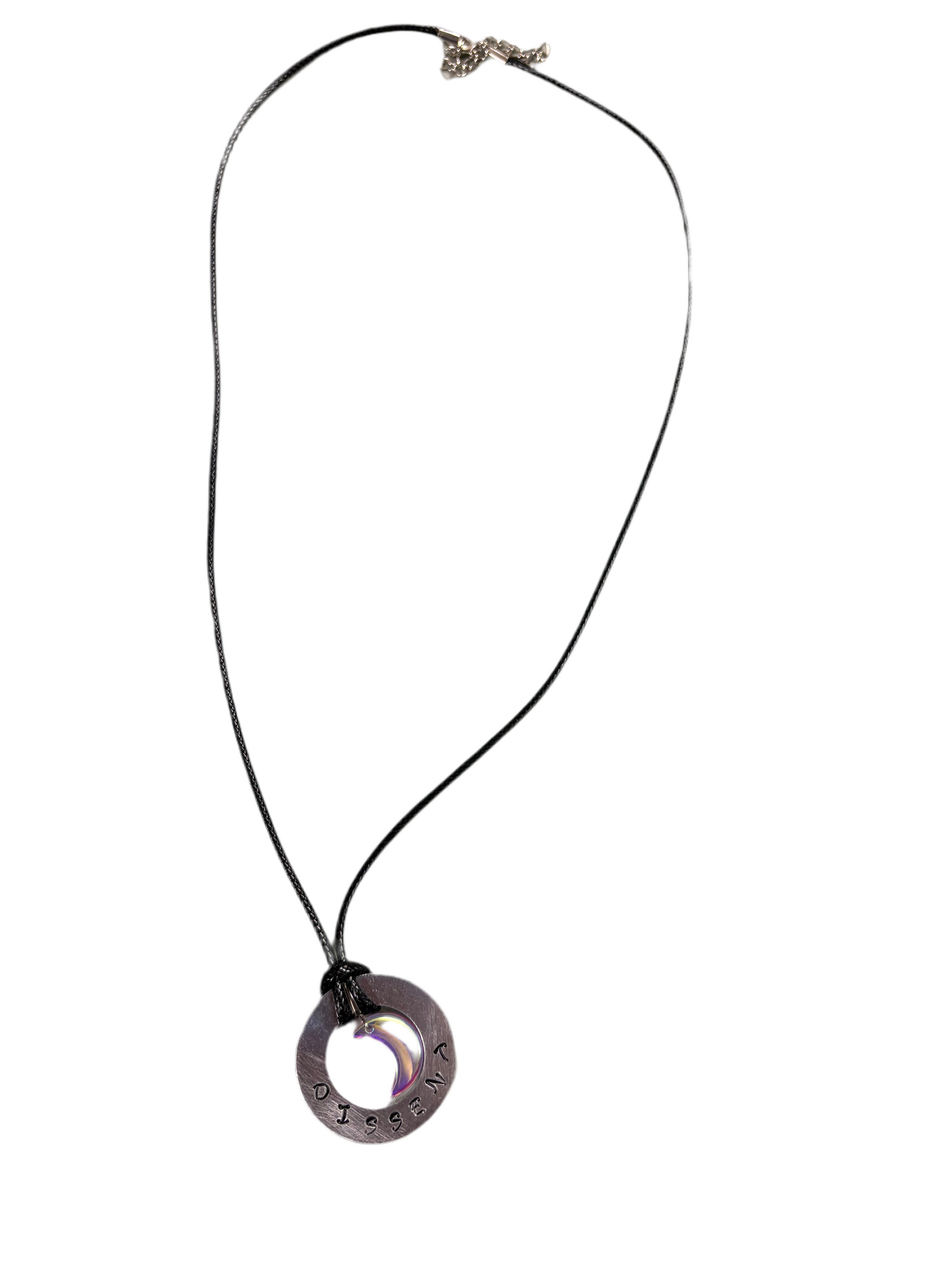 18” Cord with metal stamped words on stainless steel rings, added glass moon bead.